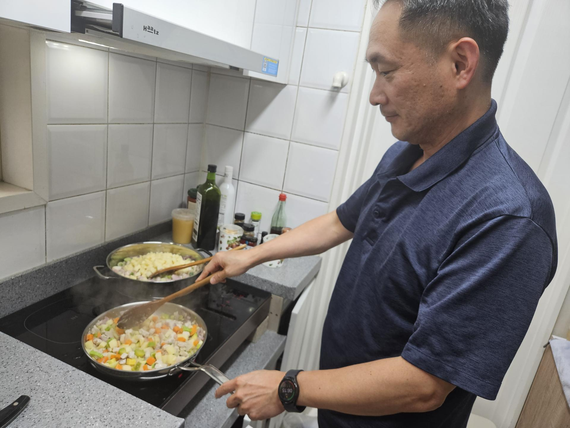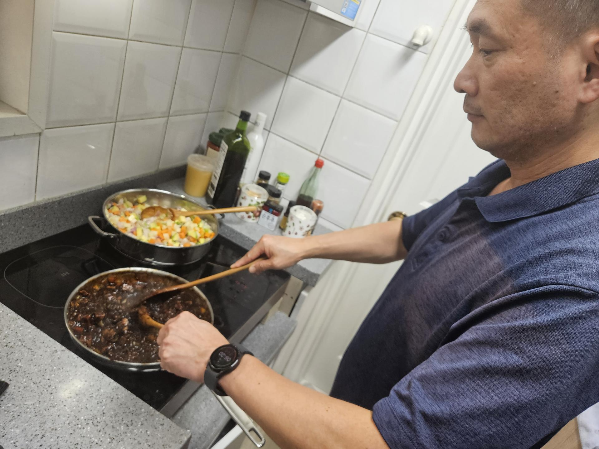 아버님과 어머님이 주방에서 공동으로 수행하는 모습이