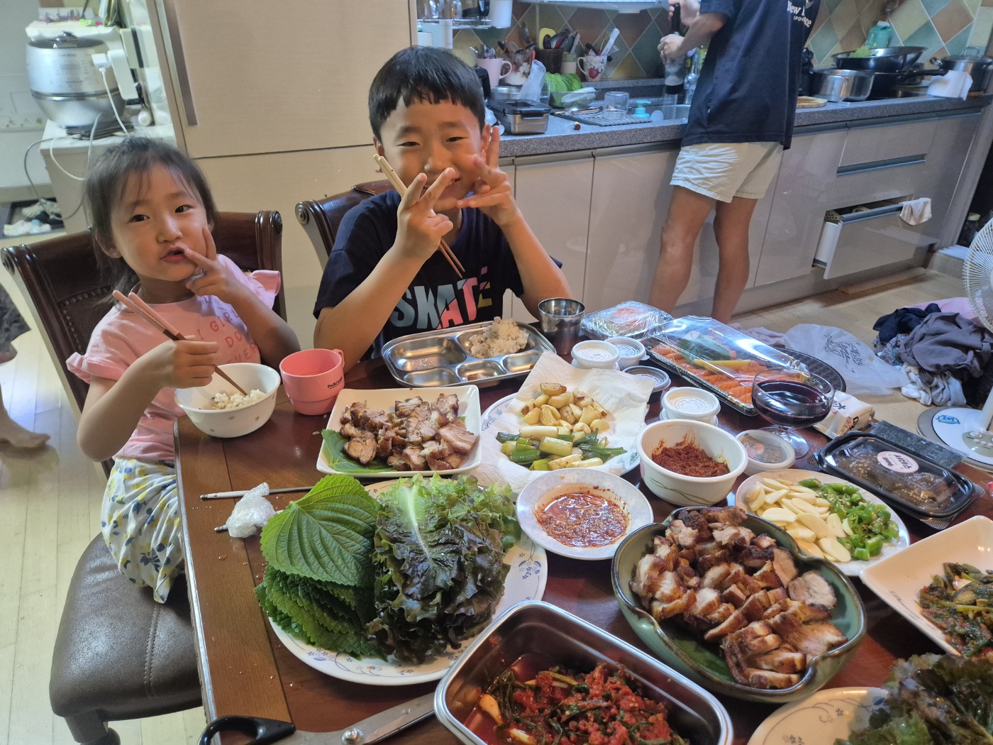 아버님의 요리 과정을 옆에서 응원하고 보조하는 아이들이 있으니 힘이 납니다.🙏